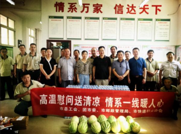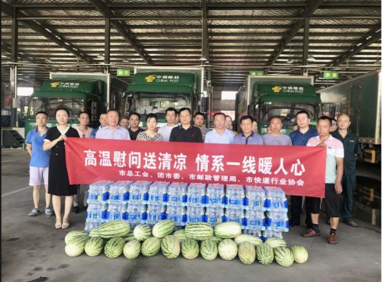 8月2日上午,咸宁市总工会张恩和副主席、团市委李雪梅副书记、市邮政管理局杨正合局长、市快递行业协会等领导一行,在市分公司辛红辉副总经理、工会负责人的陪同下,深入岔路口投递站、网路运行中心开展“关爱快递小哥 夏日送清凉”慰问活动,为战斗在高温一线的投递员、驾押员、分拣员送上矿泉水、西瓜。