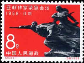 1966年的“5·16通知”是“文革”全面发动的标志。为同年“6·27”在北京召开的“亚非作家紧急会议”而发行的“纪119”从时间上划分,当是“文革”的第一套邮票。这个会议与“文革”并无关系,但两枚邮票通红的底色与中国大地上正在呼啸而来的“红海洋”是无法截然区分而开的。会议是紧急召开的,邮票的选题自然是临时安排的,邮票的设计采用了现成雕塑与证章,可见时间的紧迫。