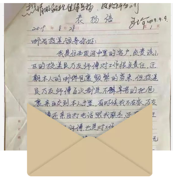 北京市分公司收到一封转自中国邮政集团公司的表扬信,信中表扬了投递员万友和刘永胜。工整的字迹、干净的文面、朴实的语言,讲述着投递员与用户之间的点点滴滴。
