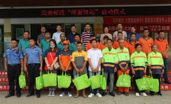 七月初夏,天高云淡,碧空如洗。为积极响应江西省总工会关于推进户外劳动者“爱心驿站”建设的倡议,贯彻落实中国邮政集团公司“人民邮政为人民”的战略部署,7月3日上午,江西省宜春市高安市总工会、高安市邮政分公司在邮政大楼支局网点举办了“邮爱驿站”服务点启动仪式。高安市总工会副主席雷庭,宜春市邮政工会副主席文乐,高安市邮政分公司副总经理、快递协会会长邓义波,高安市邮政分公司副总经理、工会主席杨礼全,高安市环卫处工会主席梁春琴,高安市城管局工会主席兰新华,高安市快递协会秘书长杨 文武,环卫工人、城管人员和快递员代表参加了启动仪式。雷庭和文乐共同为邮爱驿站揭牌。