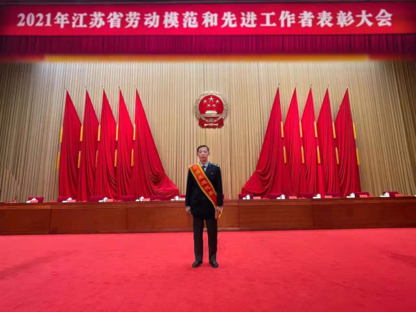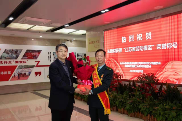 劳动创造光荣,奋斗铸就伟大。4月30日下午,江苏省劳动模范和先进工作者表彰大会在南京隆重举行,中国邮政集团有限公司常州市分公司新区营投部快递员朱新财荣获“江苏省劳动模范”称号。当天晚上,朱新财载誉归来,中国邮政常州市分公司副总经理、工会主席张宏茂到市总工会迎接。