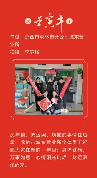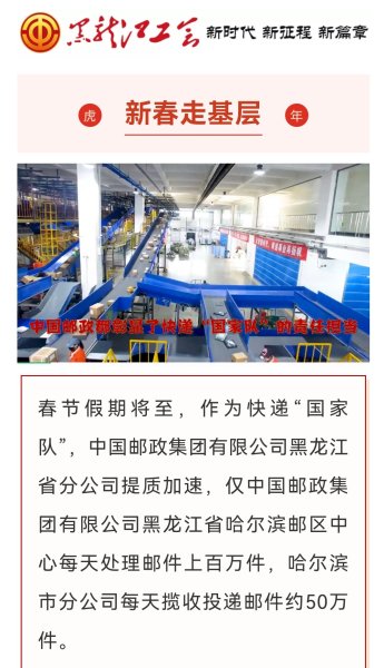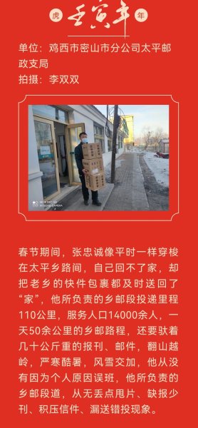 在虎年春节期间,为确保百姓民生,服务地方经济,龙江邮政职工坚守岗位、奋战一线,以实实在在的行动践行“人民邮政为人民”的服务宗旨,用辛勤和汗水诠释劳动精神,用行动和奉献祝福祖国繁荣富强。黑龙江省邮政工会组织全省邮政基层职工开展了“虎年春节我在岗”主题活动,履行职责使命,展现国企担当,塑造邮政形象。
