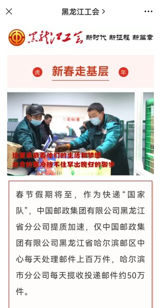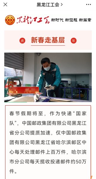 全省邮政基层职工积极踊跃地拍摄了春节在岗的工作图片和讲出发自肺腑的祝福语。黑龙江省邮政工会在“黑龙江营业厅”公众号上择优发布了4期36条图文信息。同时,省邮政工会向黑龙江省总工会积极推荐,春节期间在“黑龙江工会”公众号上发布了4条图文信息。并邀请省总工会融媒体中心记者专程采访了哈尔滨市分公司的一线职工,拍摄了“新春走基层”视频《快递“国家队”的邮路担当》,在2月3日通过“黑龙江工会”公众号进行宣传。