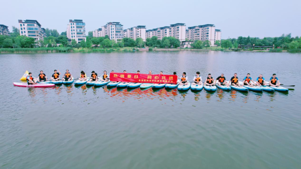 经过教练认真讲解,大家快速了解了桨板运动的操作规范和动作要领。做好安全措施后,一人一板一桨,大家勇敢开启难忘的水上之旅。微风拂面,垂柳慢摇,在波光粼粼的湖面上,大家从开始的陌生紧张,逐渐放松,慢慢的便可稳坐在桨板上划水前行了。胆大一些的,甚至可以在板上站立起来做高难度动作了。落水了也没关系,按照动作要领调整身姿,再次翻身上板,继续前行。