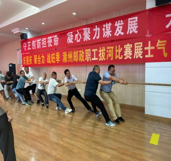 为庆祝迎接国庆七十五周年的到来,进一步增强企业凝聚力,培养企业职工团结协作精神,为了迎接旺季业务的来临,提高职工身体素质、健康水平,不断丰富职工业余文体活动,9月20日下午,滁州市邮政工会在工会五楼多功能厅组织开展“庆国庆、聚合力、站旺季”职工拔河比赛活动。市本部各部门90余人参加比赛。 参赛选手们精神饱满、斗志昂扬,哨声响起后全体队员提起气势、铆足干劲,双手紧握绳索,双脚钉稳地面,绳索中心的红结忽左忽右,围观观众呼声阵阵、掌声雷鸣,比赛现场人头攒动,气氛异常热烈。经过3轮近11场次激烈较量,金融业务部、城区分公司、寄递业务部获得女子组前三名,渠道业务部、寄递业务部、城区营业部获得男子组前三名。活动结束后职工们纷纷表示:“这样的活动让我们既放松了心情,也锻炼了身体,希望工会以后能多开展此类活动。”