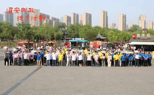 暮春时节,里运河畔的国师塔广场已是一派生机勃勃的景象。身着统一运动装的邮政职工们精神抖擞,蓝白粉黄相间的文化衫与碧水蓝天相映成趣。随着一声“出发”号令,浩浩荡荡的徒步队伍沿着4公里的滨水步道阔步向前。