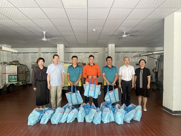 在揽投部,吴水军主席向在高温热浪“烤”验下辛勤工作的揽投员送去高温慰问大礼包20余份,内含防暑用品、水壶、饮料、防暑药、防蚊虫等实用物品,还细致查看了揽投部的作业环境与安全防护措施,特别嘱咐他们要高度重视高温季节的安全生产,务必做到劳逸结合、保障身体健康,强调要将职工劳动保护工作作为党建引领下服务群众的重要抓手,真正落到实处。