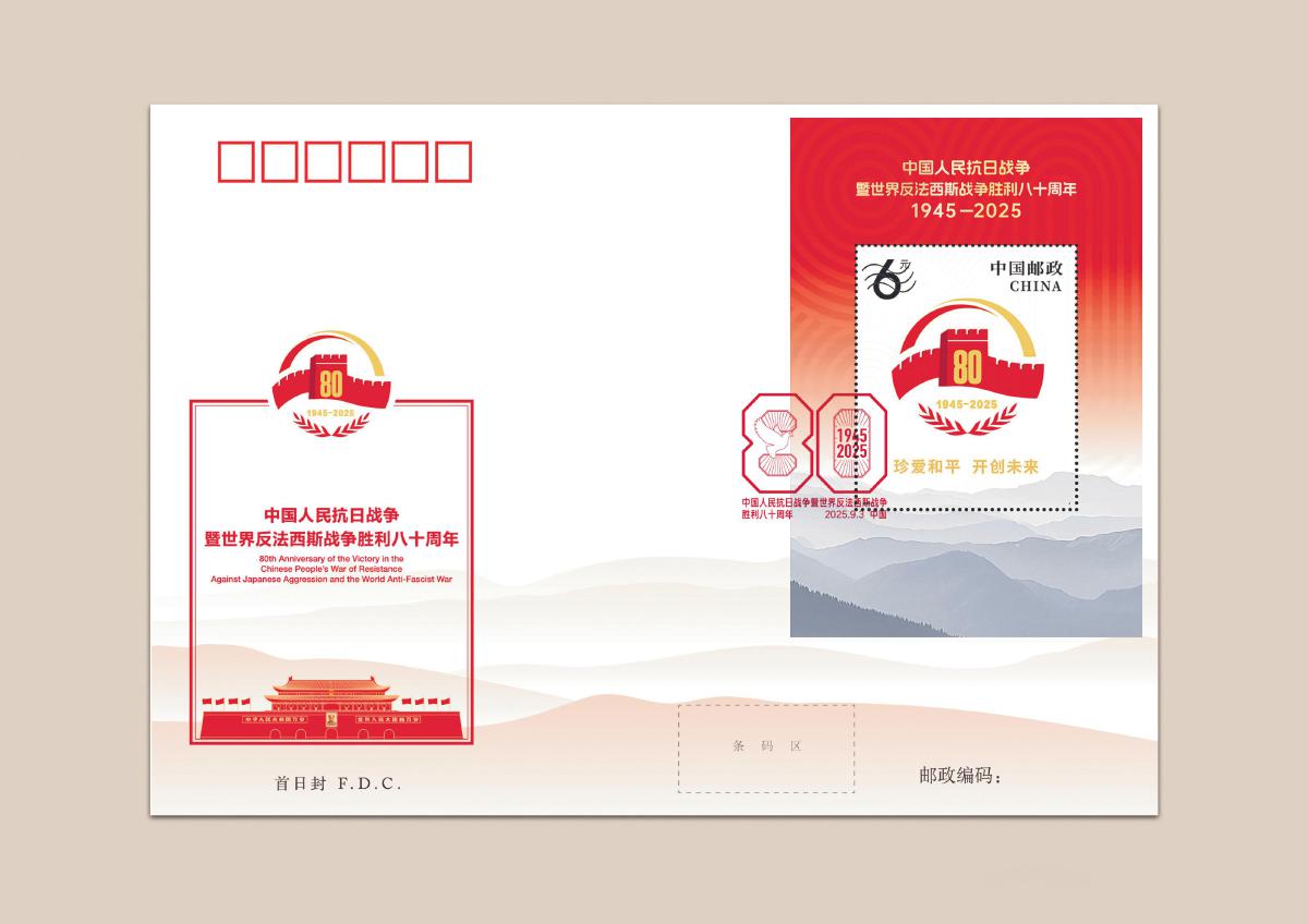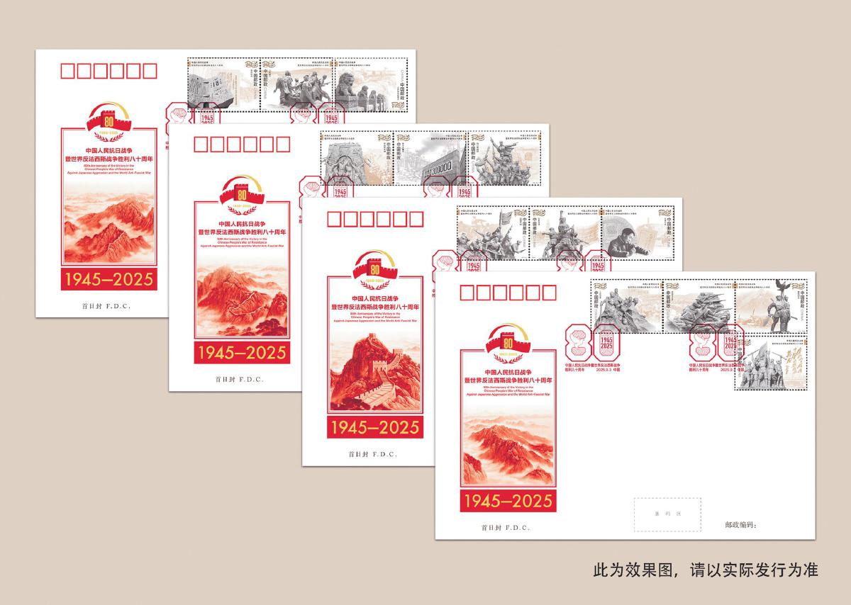 In conjunction with the issuance of the commemorative stamps 80th Anniversary of the Victory in the Chinese People’s War of Resistance Against Japanese Aggression and the World Anti-Fascist War (hereinafter referred to as the 80th war victory anniversary), China National Philatelic Company Limited, subsidiary of China Post Group Corporation Limited, will release first day covers, a PZ stamp folder and other philatelic products on the same theme, and put them on sale on September 3.
