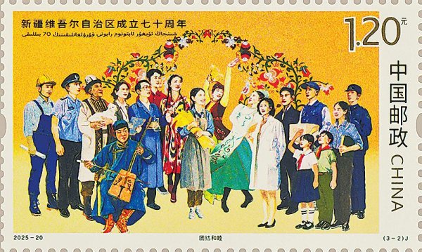 邮票图案采用岩彩绘画技法创作。第一枚“美丽新疆”,画面主体为新疆城市美景,前景绽放的玫瑰代表塔克拉玛干沙漠“锁边”工程,背景为昆仑山慕士塔格峰和卡拉库里湖。第二枚“团结和睦”,画面表现了新疆各民族、各行业群众团结和谐、亲如一家的场景。第三枚“开放高地”,画面以中欧班列、霍尔果斯国门为主体,远景展现了乌鲁木齐国际机场、光伏电站和博格达峰。邮票充分展现了在新疆这片美丽、广袤的土地上,传统与现代交织,自然与人文共生,古老与青春共舞;生动描绘了各族群众获得感、幸福感、安全感不断增强的美好图景,各族群众像石榴籽一样紧紧抱在一起,在中国式现代化进程中更好建设团结和谐、繁荣富裕、文明进步、安居乐业、生态良好的美丽新疆。
