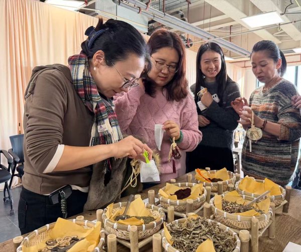 活动伊始,在专业讲解员的引导下,大家步入“登楼游园”古代生活器物展的雅致空间。一件件古朴典雅的家居器物与文房雅玩静静陈列,仿佛在诉说旧时生活的从容与诗意。职工们驻足细观,沉浸于传统美学的意境之中,在器物与空间的对话里,感受跨越时空的生活智慧与人文韵味。随后进行的古法香囊手工制作环节,将现场氛围推向高潮。大家兴致盎然,选取丁香、桂花、吴茱萸等天然香料,依个人喜好精心配比、细心填装,在一捻一放之间,不仅体验着手作的专注与成就感,更在幽幽香气中舒缓情绪、静心宁神。不一会儿,一个个独具个人风格的解压香囊陆续完成,成为每位职工专属的“情绪调节小物”。