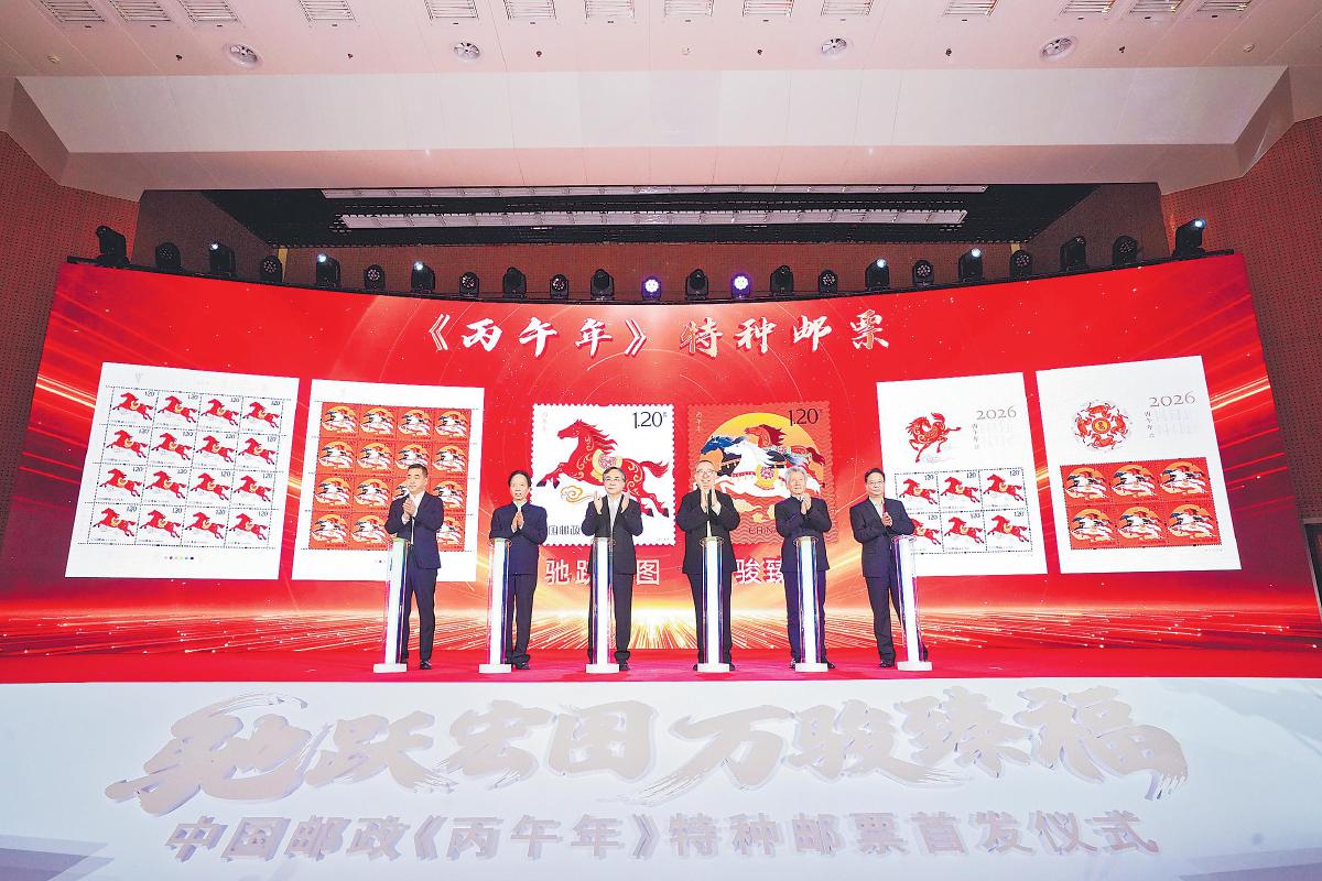 The whole set of the Bing-Wu Year special stamps consists of two stamps. The first stamp, named “Galloping Toward Grand Aspirations”, depicts a crimson horse galloping through auspicious clouds, with its mane fluttering like flames, expressing best wishes that, in the new year, China’s economic and social development will continue to make steady and long-term progress and forge ahead toward the major goals of the 15th Five-Year Plan period (2026-2030) under the Party’s leadership. The second stamp “Myriad Steeds Heralding Blessings” features three gallant steeds running shoulder by shoulder amid auspicious patterns, symbolizing that people from all ethnic groups across the country will pool their tremendous strength and unite with one heart on the journey to build China into a modern socialist country in all respects and advance the great rejuvenation of the Chinese nation on all fronts.