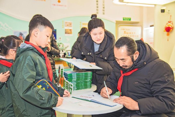 活动尾声,其美多吉与儿童邮局的师生,在点缀着马年新春元素的邮局前并肩合影。镜头定格下一张张灿烂笑脸,孩子们眼中被榜样精神点亮的光芒,比现场的年味装饰更显耀眼。(图为赠书环节,其美多吉为学生在绘本上签名。)
