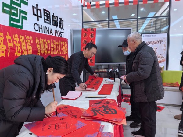 短短两小时活动,墨香四溢,氛围热烈。书法老师挥毫泼墨,为客户送上寓意吉祥的春联和福字,一幅幅精美的书画作品在老师笔下应运而生。这些作品不仅展现了老师深厚的艺术功底,表达了老师们对邮政事业的热爱和祝福,更是让广大客户和员工深切感受到了来自省、市邮政工会的温暖与关怀。