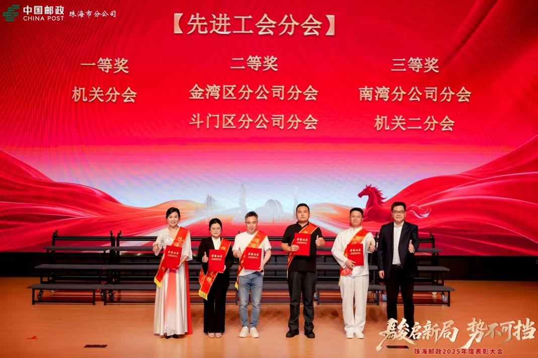 2月10日晚,伴随着雄壮激昂的开场鼓声,珠海邮政2025年度先进表彰颁奖晚会在珠海市工人文化宫隆重举行。珠海市分公司党委书记、总经理朱平,副总经理兼工会主席李 敏等党政领导班子全体成员出席会议,并为2025年度先进单位、先进个人及先进工会组织、优秀工会工作者逐一颁发奖状。