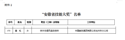 近日,安徽省人力资源和社会保障厅发布《关于表彰第十五届全省高技能人才的决定》,池州市分公司员工童虹成功获评“安徽技能大奖”并获官方表彰。童虹同志长期扎根邮政基层一线,在技能钻研上刻苦求索,在业务实践中锤炼本领,将专业能力充分转化为服务效能,在平凡岗位上创造了不平凡的业绩,成为池州邮政技能人才队伍建设的优秀典范。