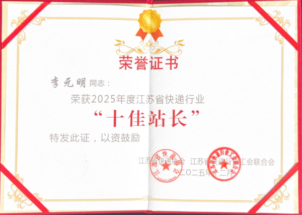 3月16日,江苏省快递协会、江苏省快递行业工会联合会联合发文,表彰2025年度江苏省快递行业“十佳站长”,宿迁邮政城区寄递事业部运河南路揽投部经理李元明荣耀上榜,成为全省邮政系统唯一获此殊荣的个人。