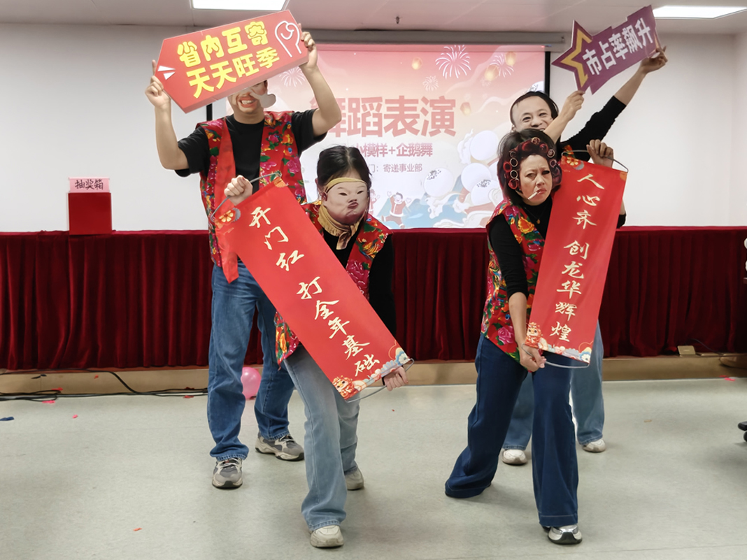 活动现场,全体员工欢聚一堂、暖意融融,气氛热烈非凡。趣味游戏环节精彩纷呈,猜灯谜、巧丢沙包、双人协作、踩气球等项目轮番登场。各项游戏中,看似简单的规则,实则考验着搭档间的信任与配合,唯有互相补位、反应迅速,才能脱颖而出。这些趣味竞技不仅锤炼了员工的团队协作能力与反应速度,更在欢声笑语中拉近了彼此距离,进一步增强了团队的凝聚力与向心力。游戏之余,寄递团队的同事们献上了精彩的《企鹅舞》表演,最后别出心裁的结束造型,寓意着龙华局“人心齐、勇争先、创辉煌”的美好愿景,为活动增添了别样惊喜。