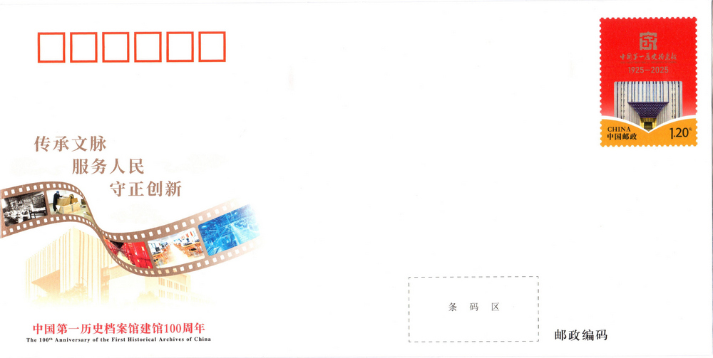 中国邮政定于2025年10月10日发行《中国第一历史档案馆建馆100周年》纪念邮资信封1套1枚。详情如下: