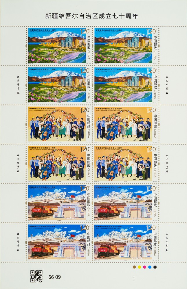 China Post is to issue a set of three commemorative stamps entitled The 70th Founding Anniversary of Xinjiang Uygur Autonomous Region on September 21. The designs are named Amazing Xinjiang, Unity and Amity and Opening-up Highland. The denomination of the whole set is 3.60 yuan, and the planned circulation is 4.90 million sets. The designs are created with rock-color painting techniques. The first design, Amazing Xinjiang, takes the beautiful urban scenery of Xinjiang as the main elements. The blooming roses in the foreground symbolize the sand stabilization and desert-edge containment project in the Taklimakan Desert, and the background features Muztagh Ata of Kunlun Mountains and Karakul Lake. The second design, Unity and Amity, shows the scene of unity, harmony and affinity among people of different ethnic groups and all walks of life in Xinjiang. The third design, Opening-up Highland, mainly features a China-Europe freight train and the national gate in Khorgos, with the Urumqi Tianshan International Airport, a photovoltaic power station and Mount Bogda as the distant view. The stamps vividly depict a beautiful picture where people of different ethnic groups enjoy an increasing sense of fulfillment, happiness and security. United closely like the seeds of a pomegranate, people of different ethnic groups there are working together to build Xinjiang into a beautiful region that is united, harmonious, prosperous and culturally advanced, with healthy ecosystems and people living and working in contentment in the process of advancing Chinese modernization. This set of stamps is printed with offset technology. With saturated colors, delicate details, rich texture and a prominent thematic focus, it clearly presents Xinjiang’s iconic landscapes and regional characteristics through bright hues. The localized fluorescent effect enhances the thematic representation of the stamps, creating visually cohesive and harmonious composition and improving the overall aesthetic appeal. The stamps are designed by Li Dan, edited by Wang Jing, and printed by Beijing Stamp Printing House Company Limited with offset technology. The stamps will be available for six months at designated postal outlets nationwide, online mall of China Philately (https://jiyou.11185.cn), the mobile app of China Post, the WeChat Mall for philatelic products in the official WeChat account and the WeChat mini program of China Post Group. To present more information about the stamps, China Post will release their digital content through the WeChat mini program “Encyclopedia of China Philately and Stamps”, where philatelists can learn more about the stamps via its AR function. |