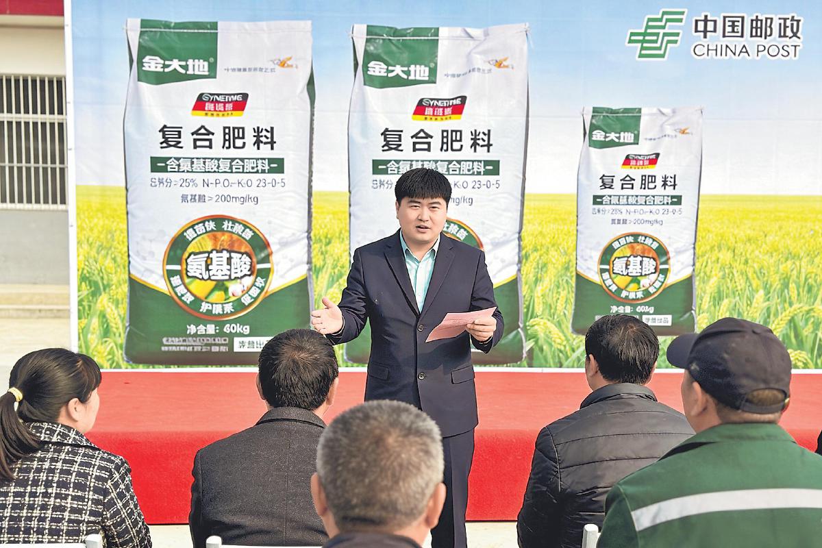 沧州邮政工作人员在农资产说会上推介优质化肥。□张岚 摄