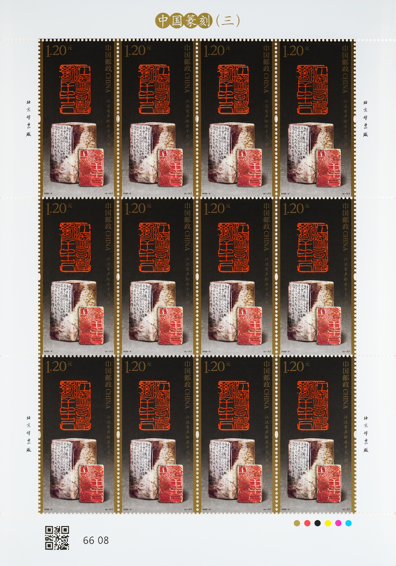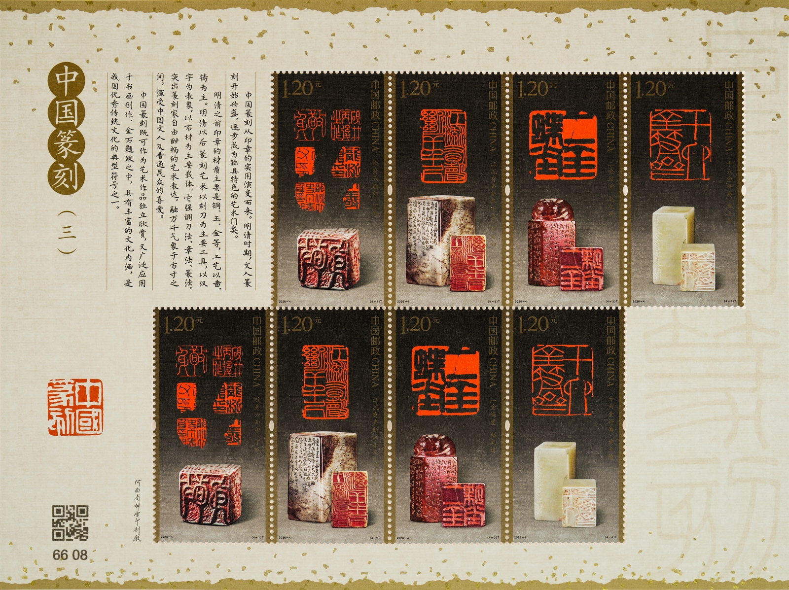 中国邮政定于2026年4月20日发行《中国篆刻(三)》特种邮票1套4枚。详情如下: